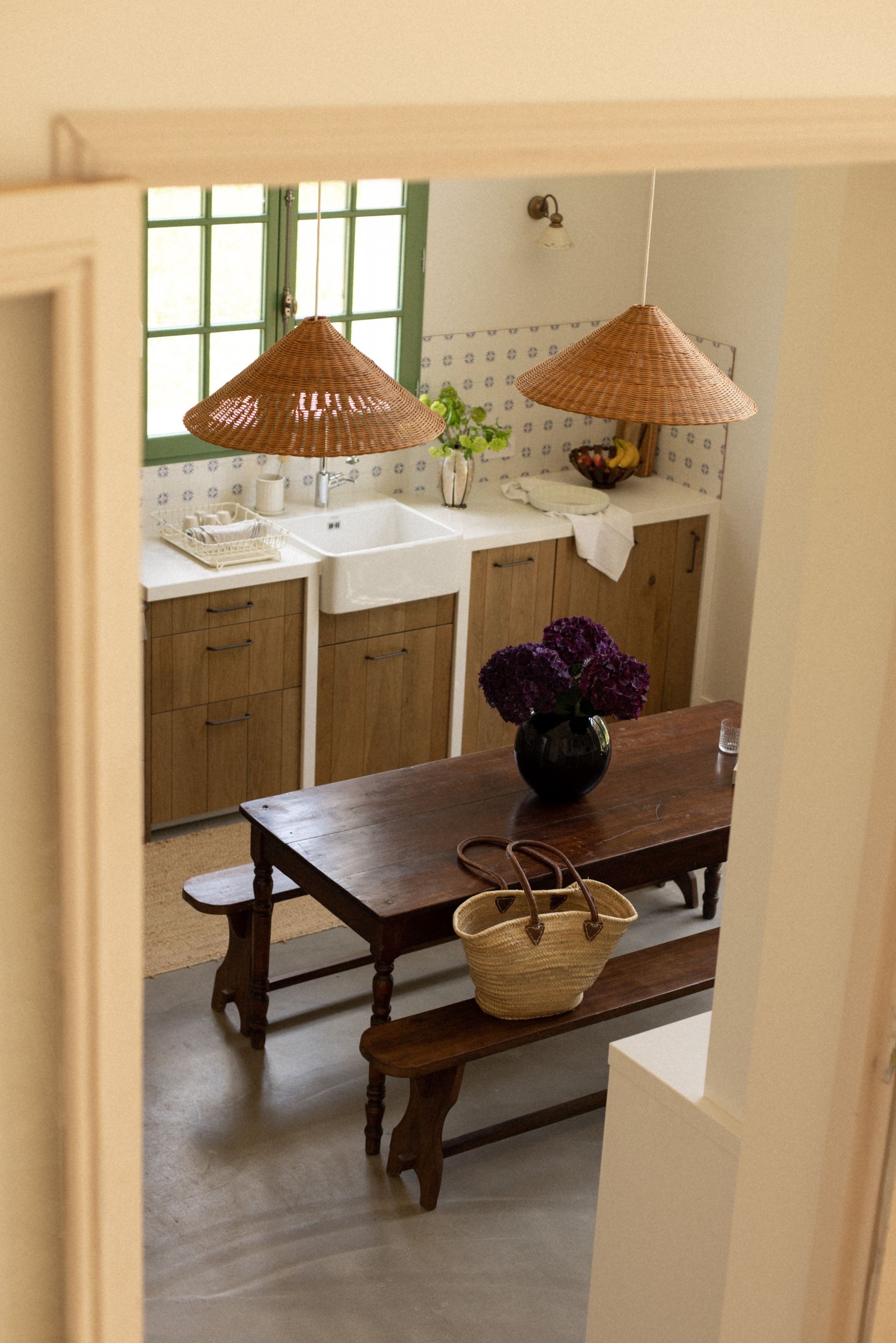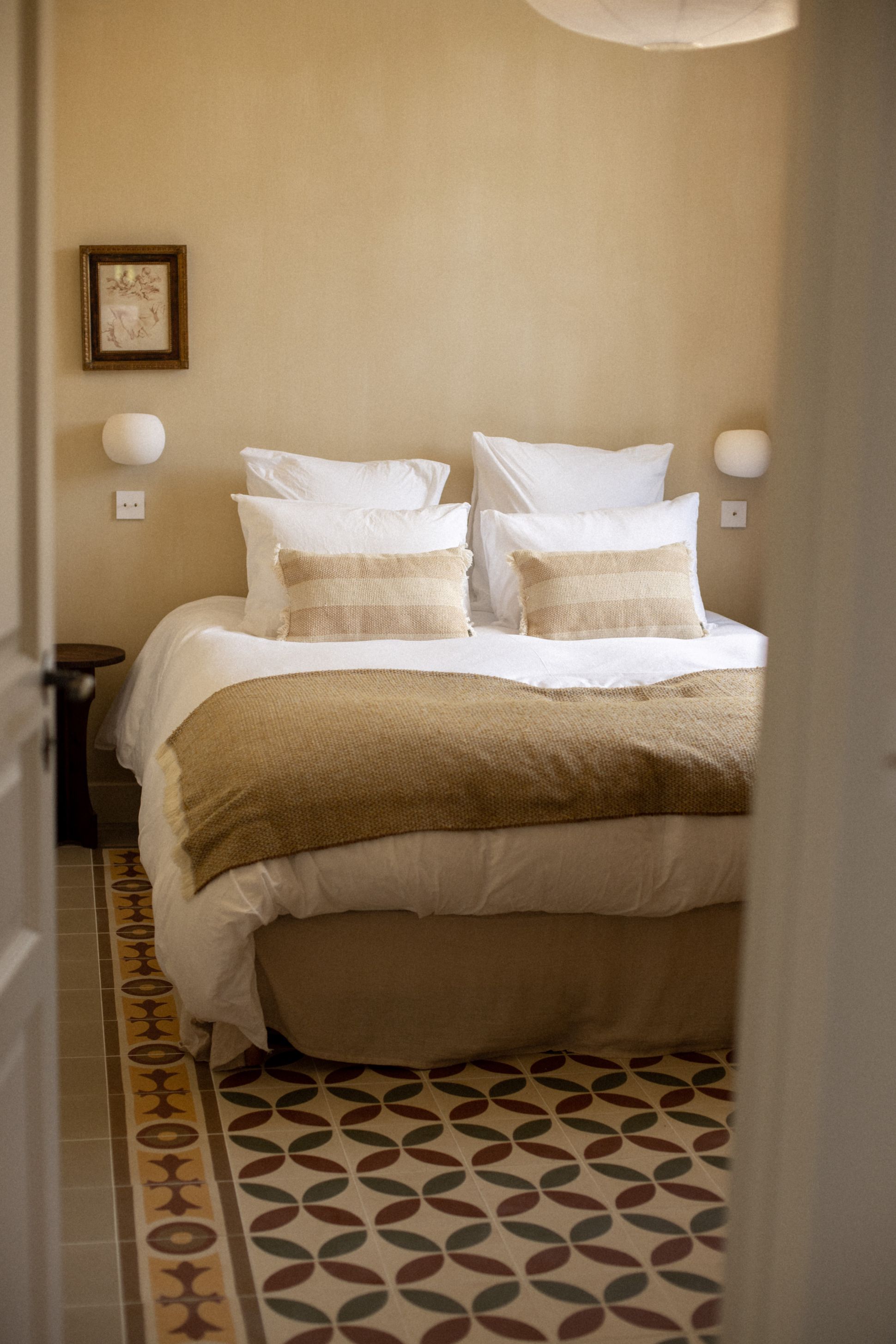 Enfant, j'ai passé toutes mes vacances en Espagne et Édouard et moi sommes beaucoup allés en Italie. L'esthétique méditerranéenne me plaît donc beaucoup. Ici, on a essayé de coller à cet esprit. D'abord, les murs blanchis à la chaux ont leur importance. Attention, c'est une application spéciale : elle est effectuée à la française, tout à fait verticale. L'idée était de s'inspirer des palazzi qu'on voit dans les Pouilles, plus largement des murs méditerranéens. Au sol, nos carreaux de ciment de l'entrée rappellent aussi cette idée. Pour la décoration, j'ai tout chiné, au fur et à mesure. Je n'achète pas dans les ventes aux enchères, je chine plutôt sur Leboncoin ou Selency, en brocante aussi. Il y a certaines pièces récupérées chez ma grand-mère. Je n'avais rien de très précis en tête. Ma seule contrainte, c'était de ne pas partir dans tous les sens, qu'il y ait une harmonie de décor ; et parce qu'on voulait louer, il fallait calmer le jeu de la déco, faire quelque chose d'assez serein et neutre, tout en essayant d'être un poil atypique.
