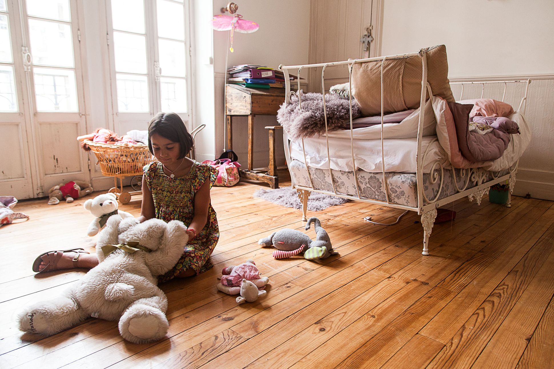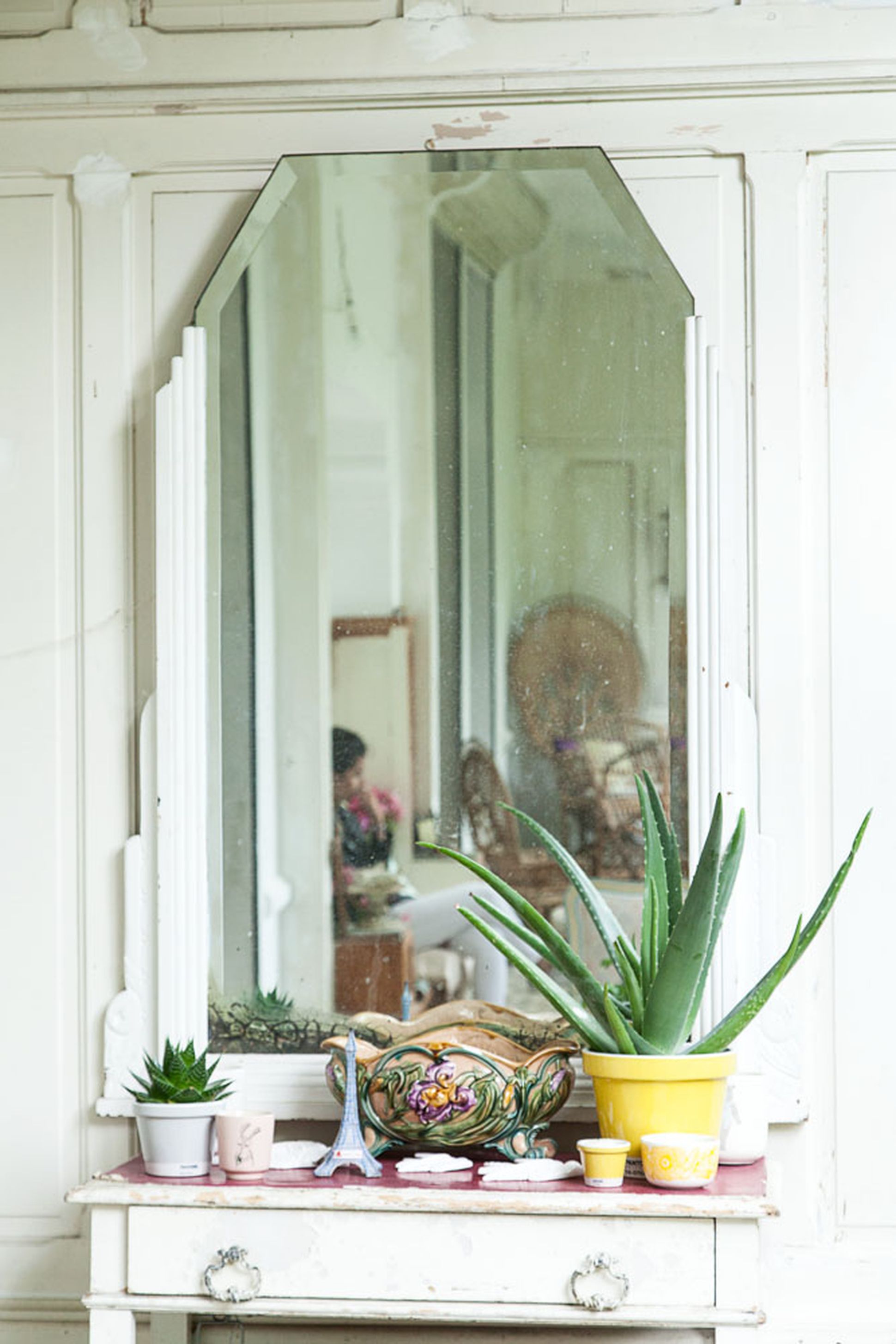 Quelque chose comme un style « mémé à bouclettes » avec beaucoup de frous-frous, de couleurs. On chine énormément, souvent sans idée préconçue mais plutôt au coup de cœur, avec une légère tendance à l’accumulation. On apprécie aussi beaucoup ce qui est italien et Julien adore les chevaux de bois et les vieux jouets d’enfants. De mon côté, j’aime fleurir la maison avec des fleurs fraîches de saison du jardin ou d’une fleuriste dont la boutique s’appelle Atelier Floral, à Pau. Nous avons bien sûr quelques pièces plus contemporaines comme la lampe Pipistrello dans le salon rose. Mais d’une manière générale, on aime l’ancien. Ce qui a vécu. Les lits de Sidonie et Rose, par exemple, ont appartenu à ma mère et ma tante. Nous les avons repeints.